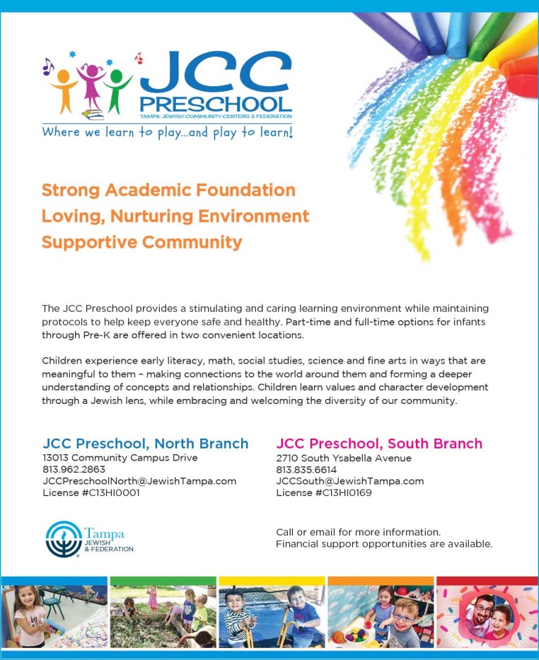 Scholarships are available for Tampa JCC Preschool, Club J Enrichment Program, and Camp JCC. Contact Julie Cameron at Julie.Cameron@jewishtampa.com for more information.